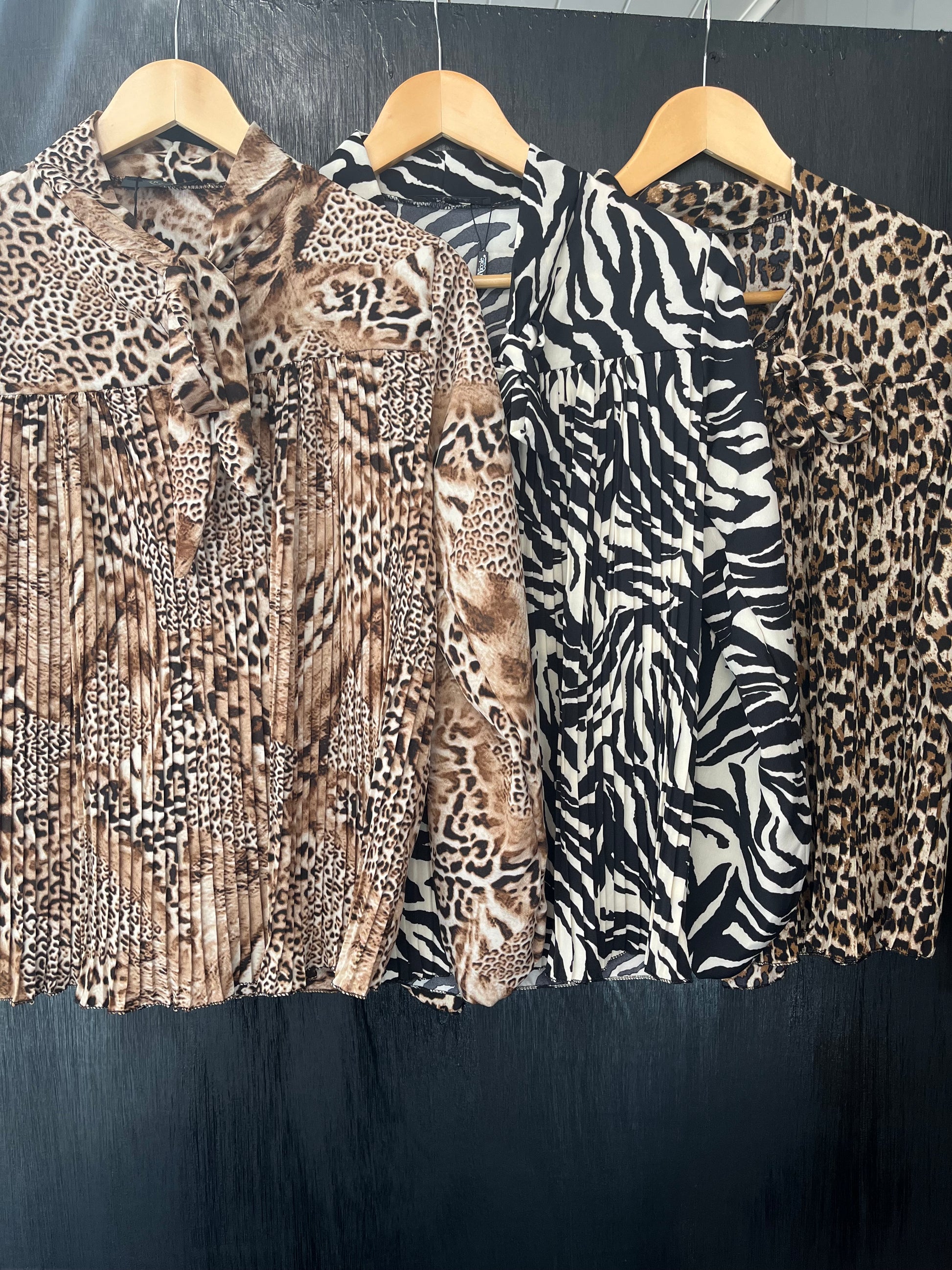 ladies pleat front tie neck animal print top