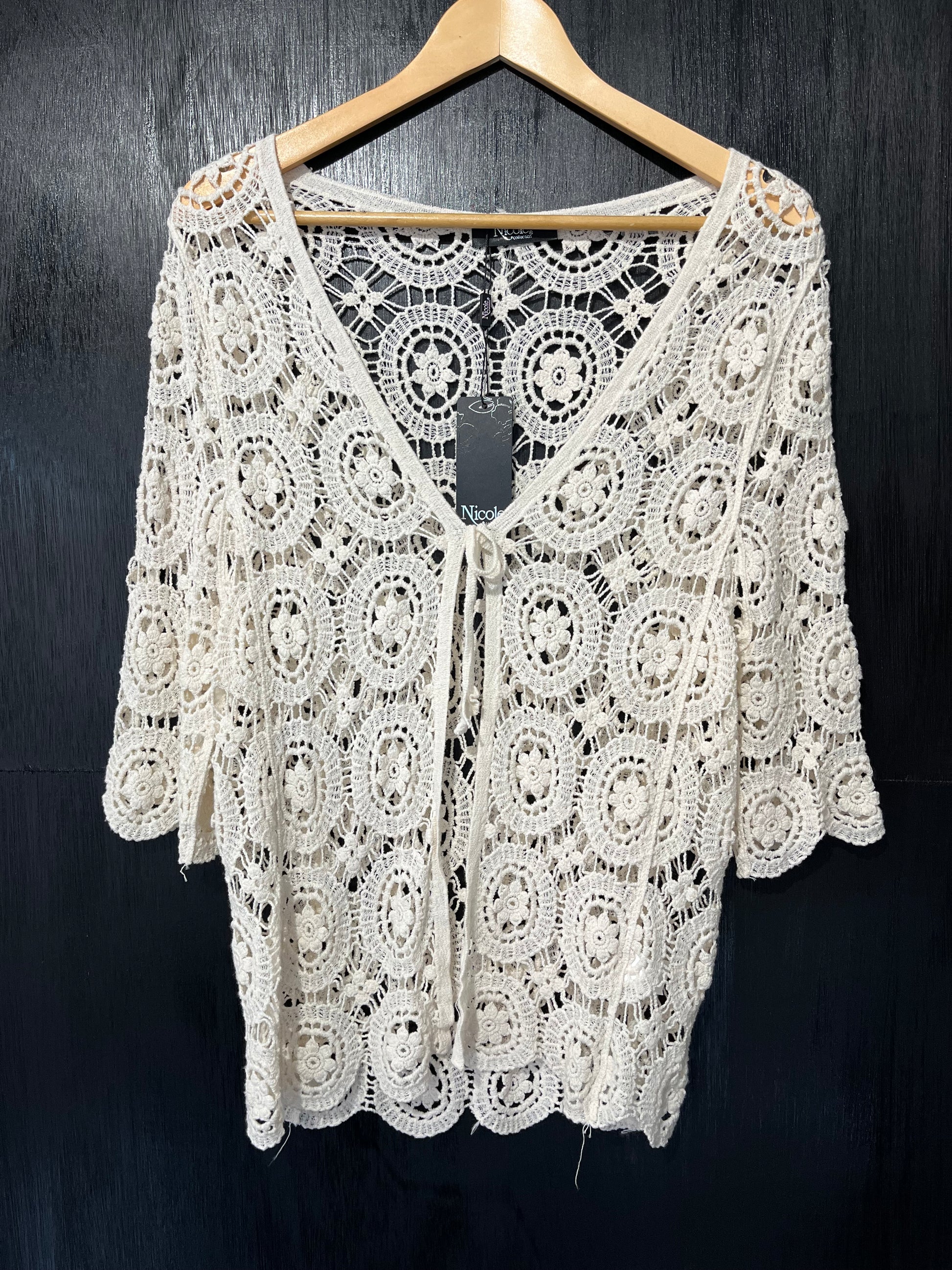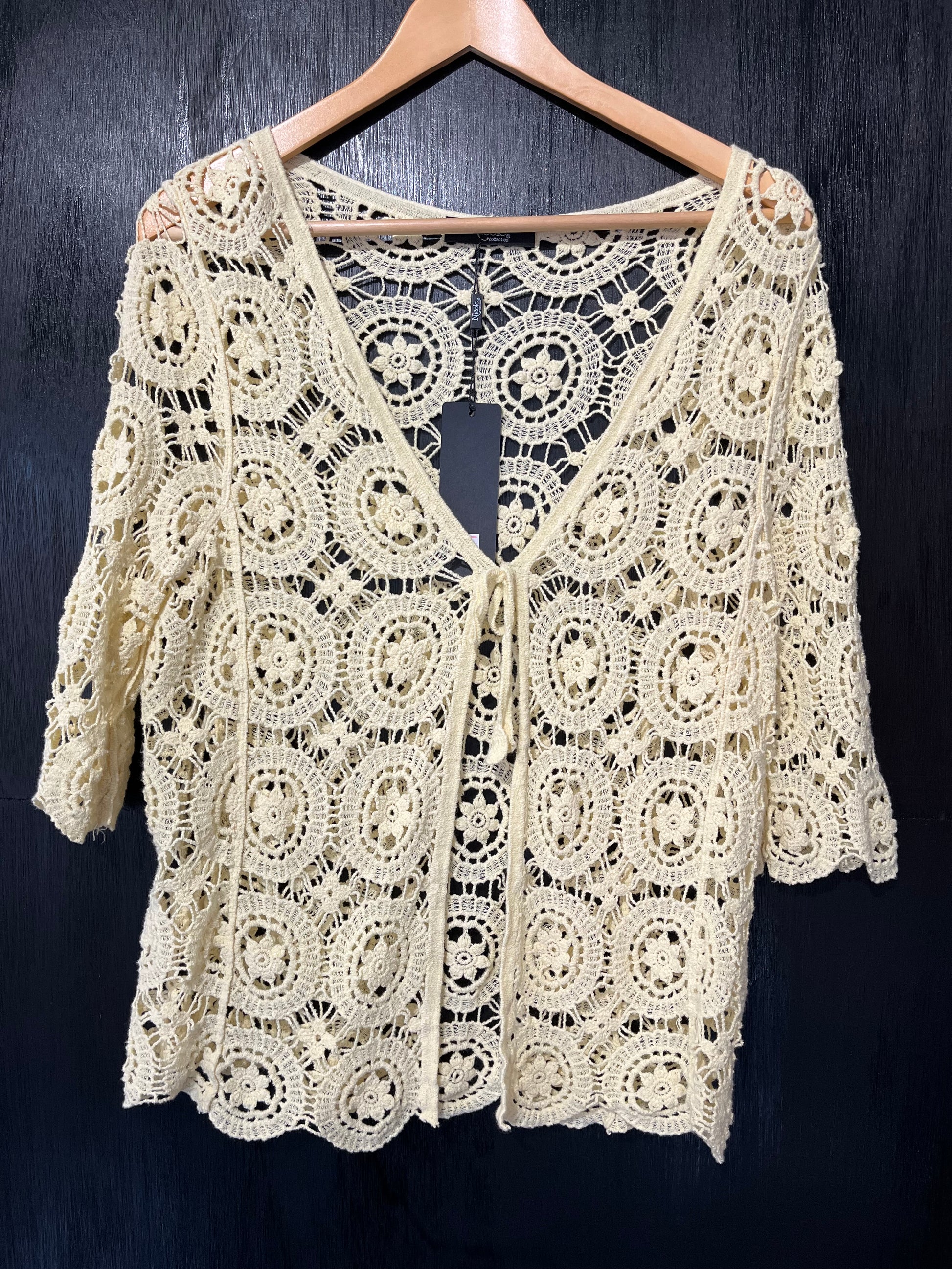 This ladies tie front crochet cardigan is a versatile and stylish addition to any wardrobe. The beautifully crafted crochet detailing adds a touch of elegance, while the tie front design allows for a customized fit. Perfect for any occasion, this cardigan offers both fashion and functionality.